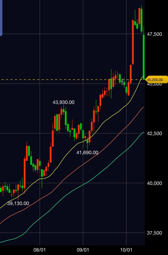 その後、日経平均先物は45,200.00円まで下げています。金曜日の日経平均の終値と比べるとマイナス2,888.88円という暴落になります。